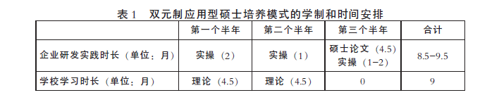 双元制应用型硕士培养除了要求课堂基本的专业知识学习之外,更看重学生在企业中的动手实践和知识运用,因此,德国双元制应用型硕士培养过程中,尤为强调学生在企业和工厂的实践体验和学习效率,时长上基本保证要不少于在校的课堂学习,并且强调集中学习。因此,大多数应用科学大学将双元制应用型硕士培养规定为课程与实践相结合的集中学习模式,并且将每月的教学和实践内容固定,同时要求学生在三个学期左右的全日制教学时间中,将休假时间压缩为每年的不超过一个月,剩余时间中,有将近9个月的在校理论学习,以及约8.5—9.5个月的在企业的实践实习,以此保证和加强双元制的培养质量和成效。入学时间基本为每年的3—4月(春季)或9—10月(秋季)两个时间段。具体学制和时间安排如表1.
